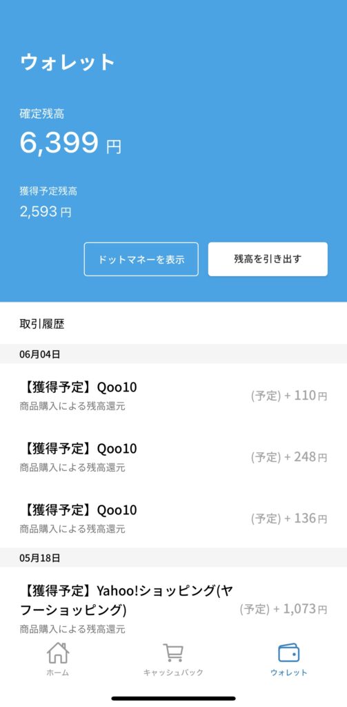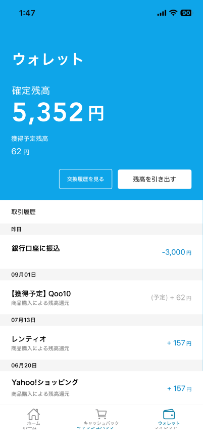 ステップ③:後日、自動的にキャッシュバックが反映される