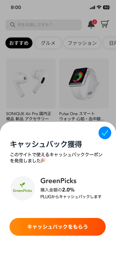 使えるキャッシュバック情報が自動的にポップアップで表示されます。